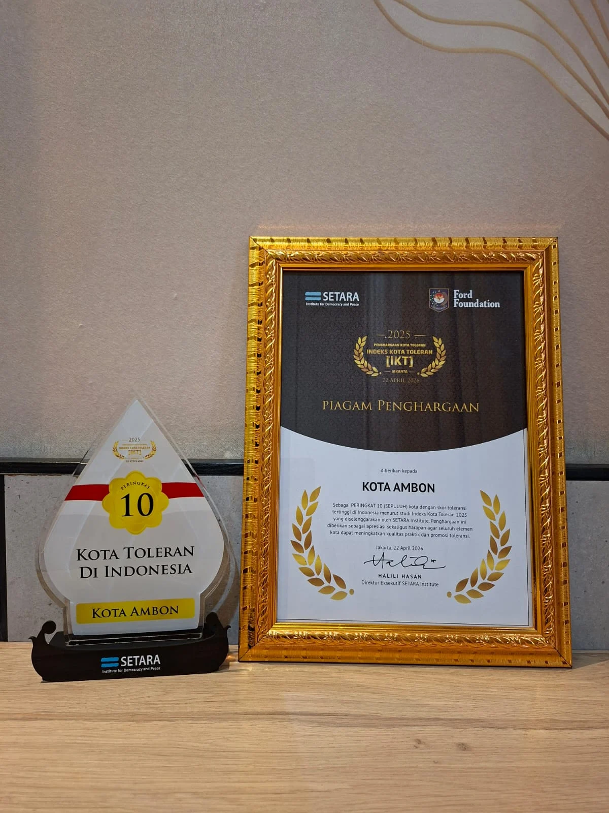 JAKARTA, PPID- Kota Ambon berhasil menduduki peringkat ke 10 Indeks Kota Toleran (IKT) Tahun 2025 dengan Skor 5,657 berdasrakan penilaian SETARA Institute yang diluncurkan Rabu (22/4/26) di Mangkuluhur Arthotel Suites, Jakarta,.